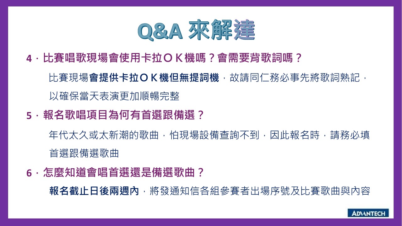 5.報名截止日後兩周內,將發通知信各組參賽者出場序號及比賽歌曲與內容。