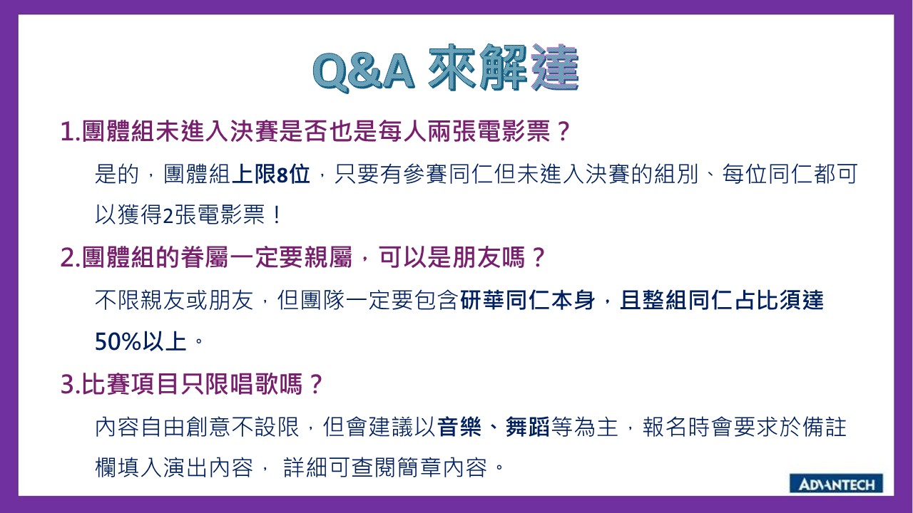 •Group: Teams of 2–8 members. Groups can include both Advantech employees and their family members, but at least 50% of the team must be Advantech employees.