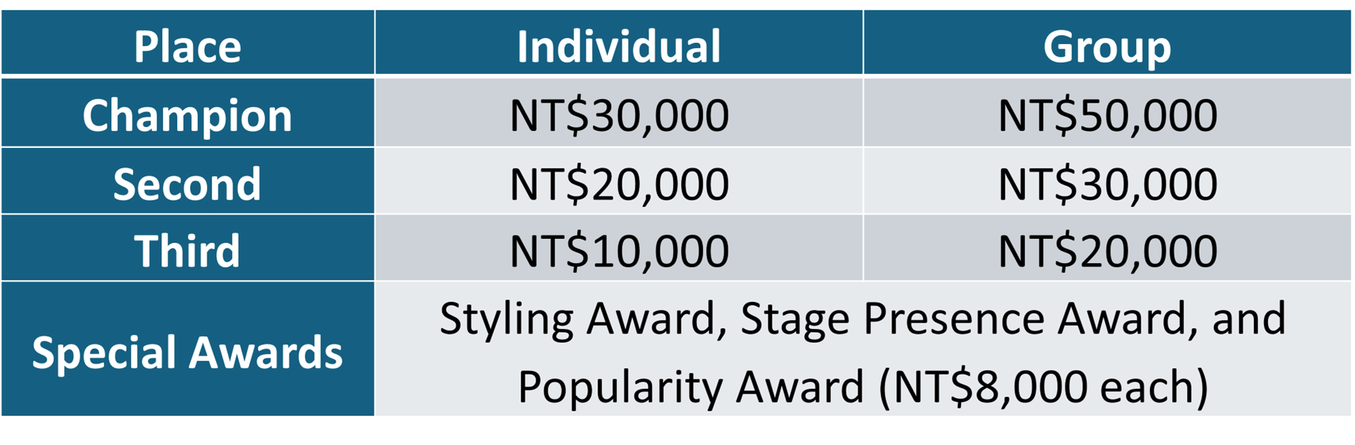 造型獎8,000元、台風獎8,000元、人氣獎8,000元 |