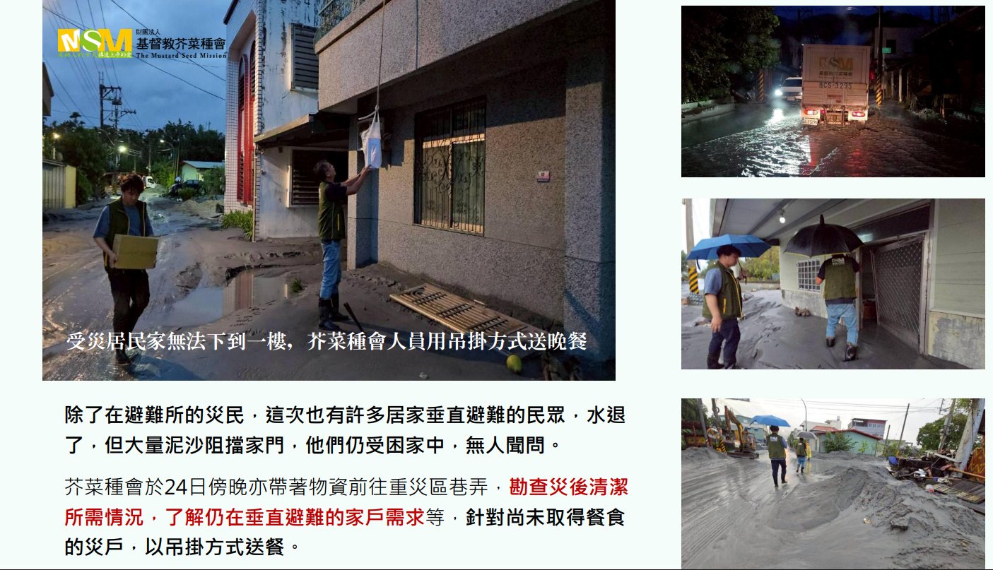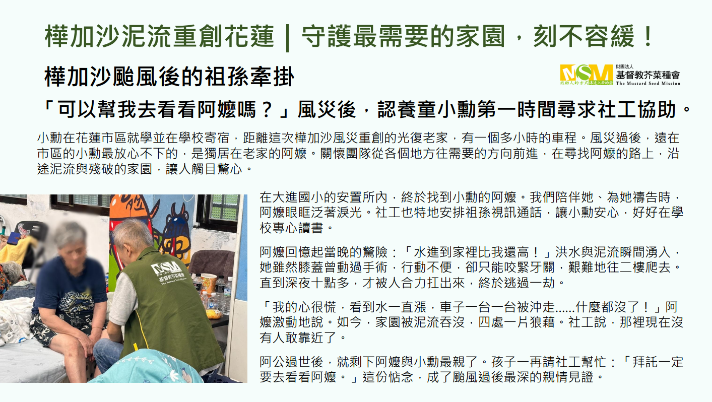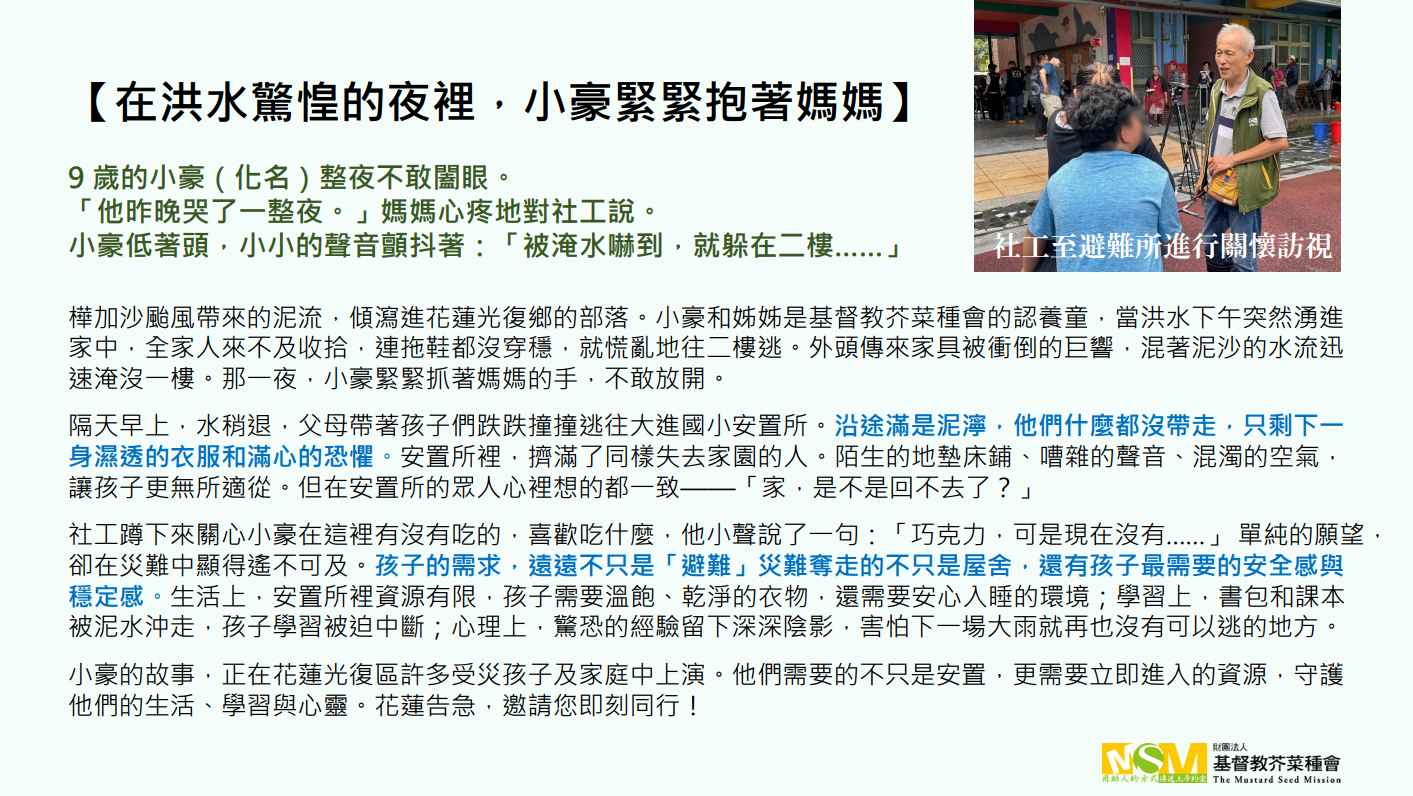 基督教芥菜種會啟動三福助人網行動,透過「福音」陪伴受災家庭,在困境中帶來安慰與盼望;「扶助」提供急難救助,以及自製的常溫茶葉蛋、冷凍熱食調理包與麵包烘焙品,同步預備卡式爐、棉被等生活必需品,即刻送往花蓮災區,此外也串聯在地教會與社區,協助家庭暫時安置;