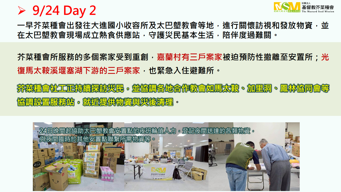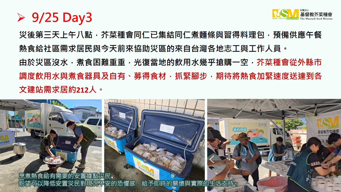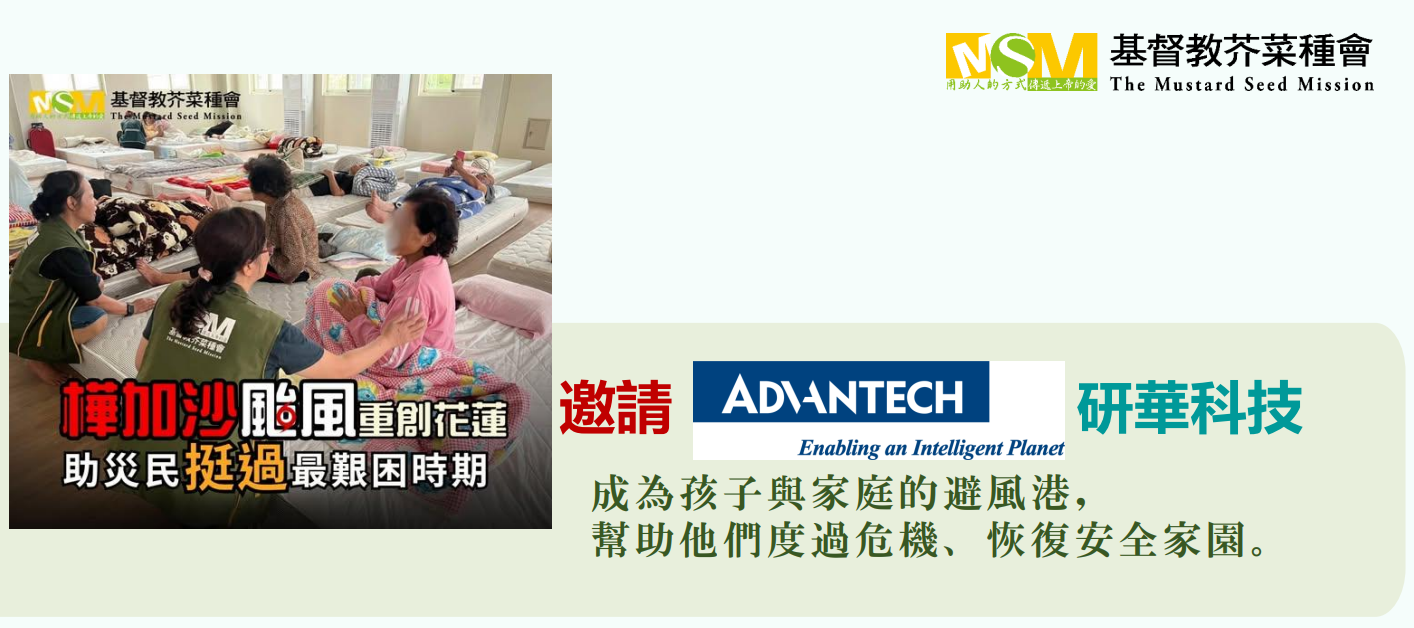 基督教芥菜種會啟動三福助人網行動,透過「福音」陪伴受災家庭,在困境中帶來安慰與盼望;「扶助」提供急難救助,以及自製的常溫茶葉蛋、冷凍熱食調理包與麵包烘焙品,同步預備卡式爐、棉被等生活必需品,即刻送往花蓮災區,此外也串聯在地教會與社區,協助家庭暫時安置;