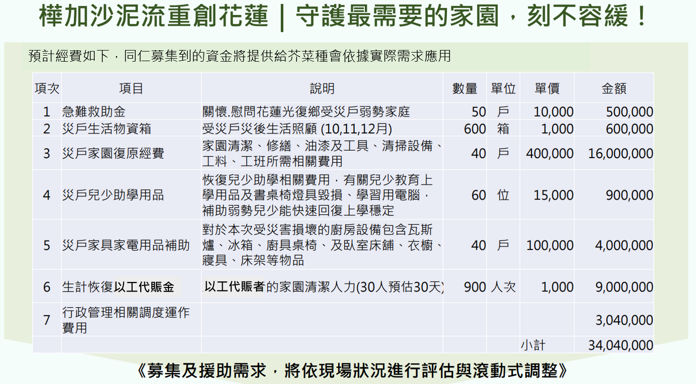 💖本次捐款款項將由芥菜種會用於花蓮樺加沙颱風(詳見下方預計經費表格):