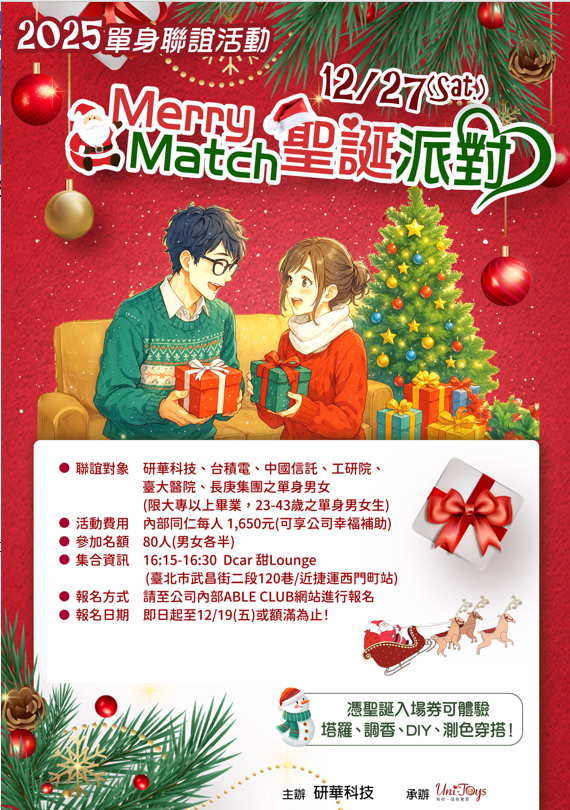 參加對象:研華單身同仁(男+女)+台積電 中國信託 工研院 .. 如超過報名人數,將依報名先後順序 使用點數:員工:25點 眷屬:30點 集合資訊:2025/12/27(六) 集合地點 : Dcar 甜Lounge(台北武昌街二段120巷/近捷運西門町站)