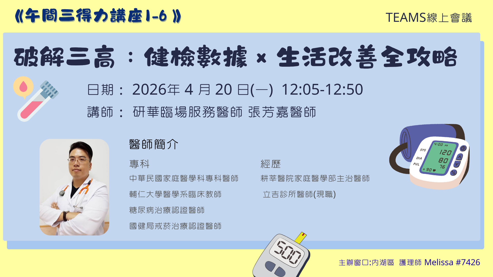 忙起來的時候,我們常常忽略身體給的提醒。其實,高血壓、高血脂、糖尿病這些「三高」問題,常常就是身體發出的早期警報,告訴我們該讓健康重新上線了。這場講座會用輕鬆好懂的方式,帶大家認識三高是怎麼形成的,也會一起看看目前台灣的三高現況,了解為什麼越來越多人受到影響。