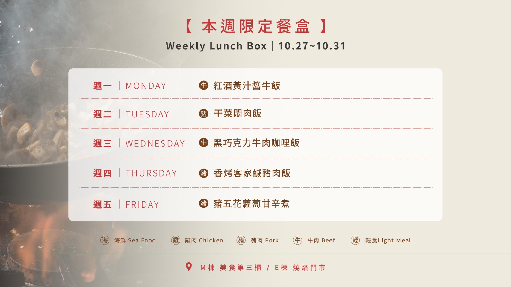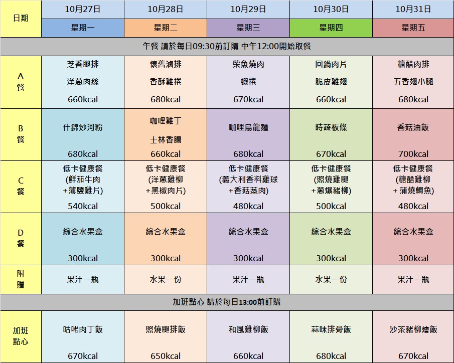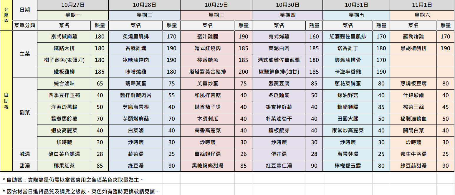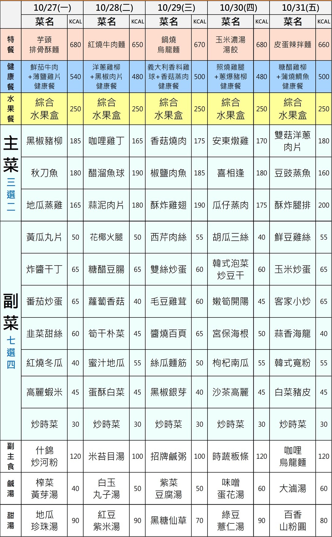 素食便當:10月27日點此 10月28日點此 10月29日點此 10月30日點此 10月31日點此