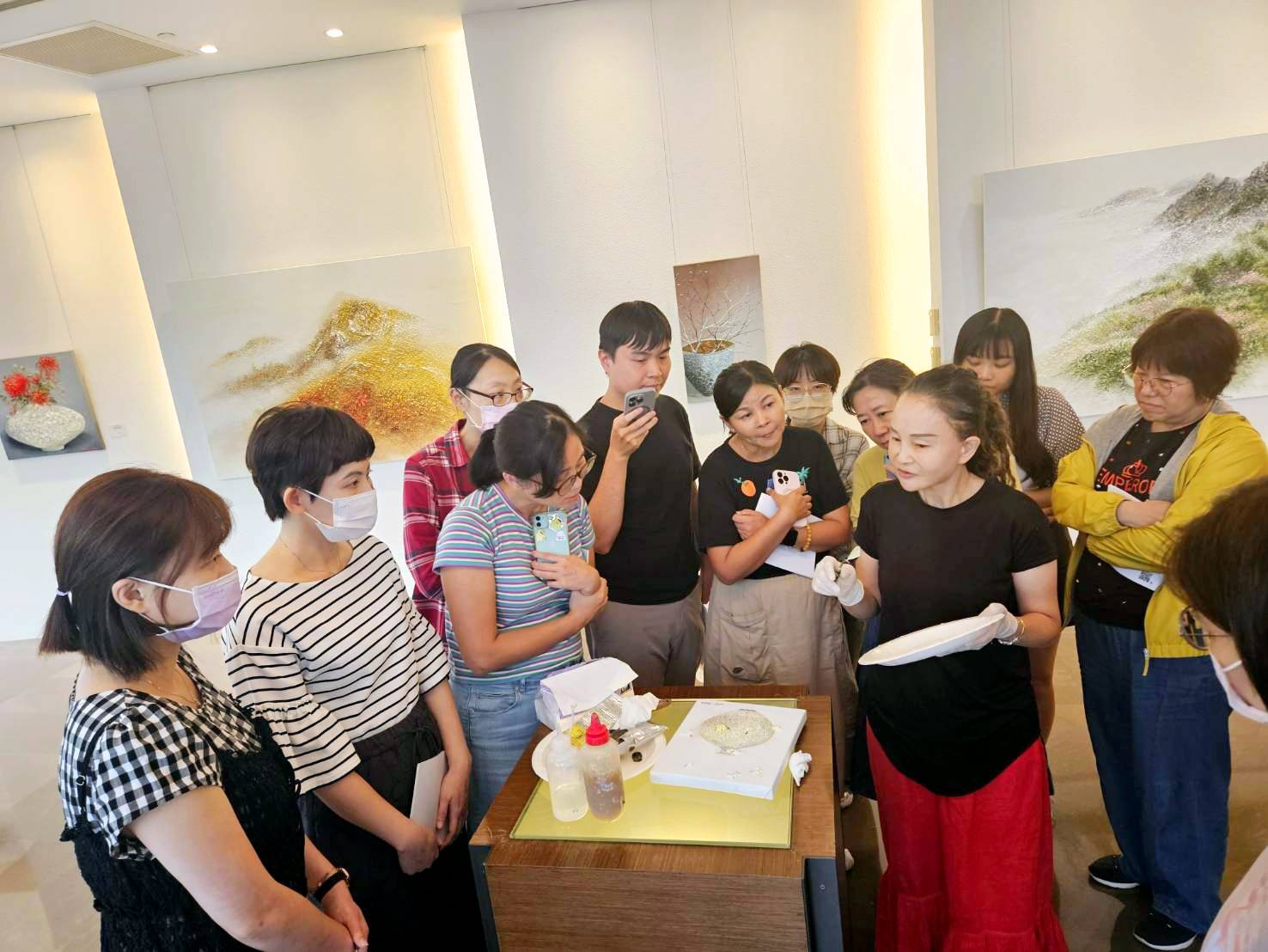 9/26這天,基金會舉辦了一場近距離的藝廊導覽活動,特別邀請陳俐維老師親自帶領同仁走進她的藝術世界。從個人生平的小故事,到畫作風格的演變與創作理念,陳老師細膩的分享讓大家聽得津津有味。從動物到花卉,再到第一幅創作的故事,都展現了她對生命的感受與表達。而在現場,她更即興示範了砌畫的創作方式,渾然天成的美感,令人讚嘆不已。