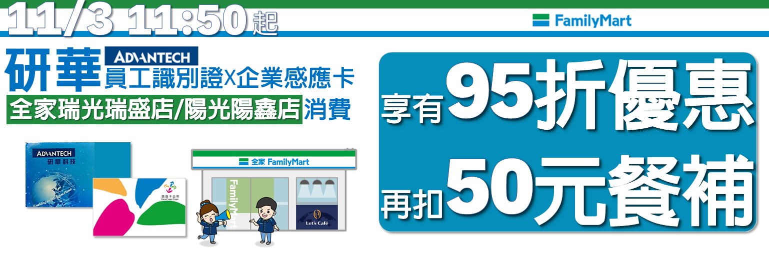 研華同仁每日 $50 餐補在全家以上2間店舖消費,可同時享有商品95折優惠。