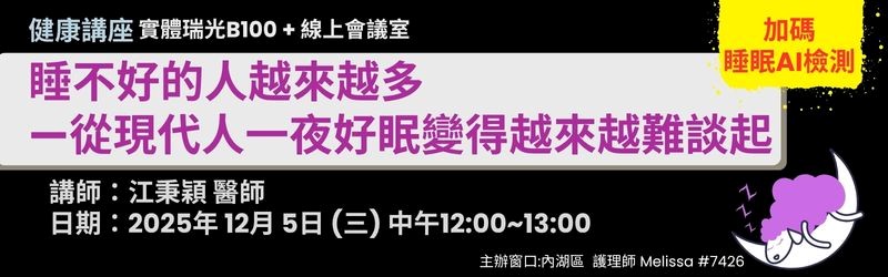 本次我們特別邀請 江秉穎醫師(思維國際連鎖睡眠醫學中心 總院長),於 12 月 5 日(五)中午在瑞光實體會場與線上會議室,帶來專題講座 「睡不好的人越來越多——從現代人一夜好眠變得越來越難談起」,深入剖析睡眠困擾的原因,並分享改善策略。