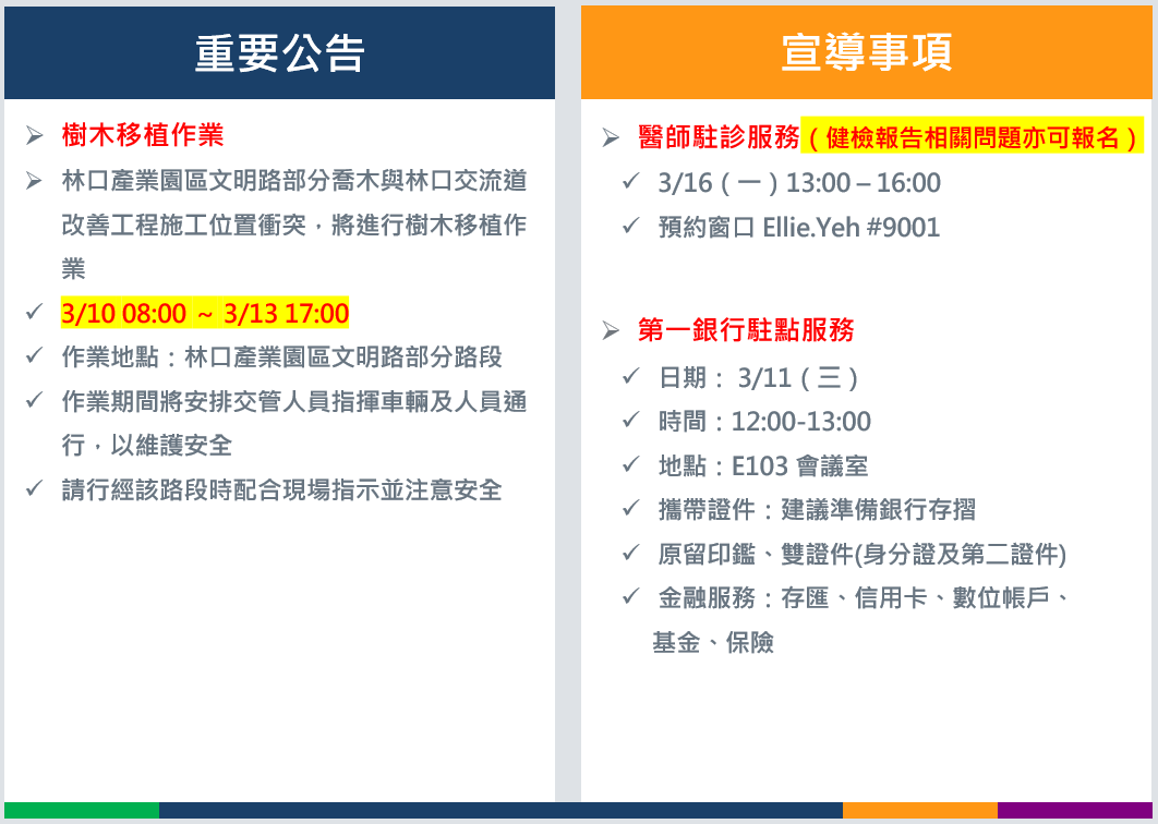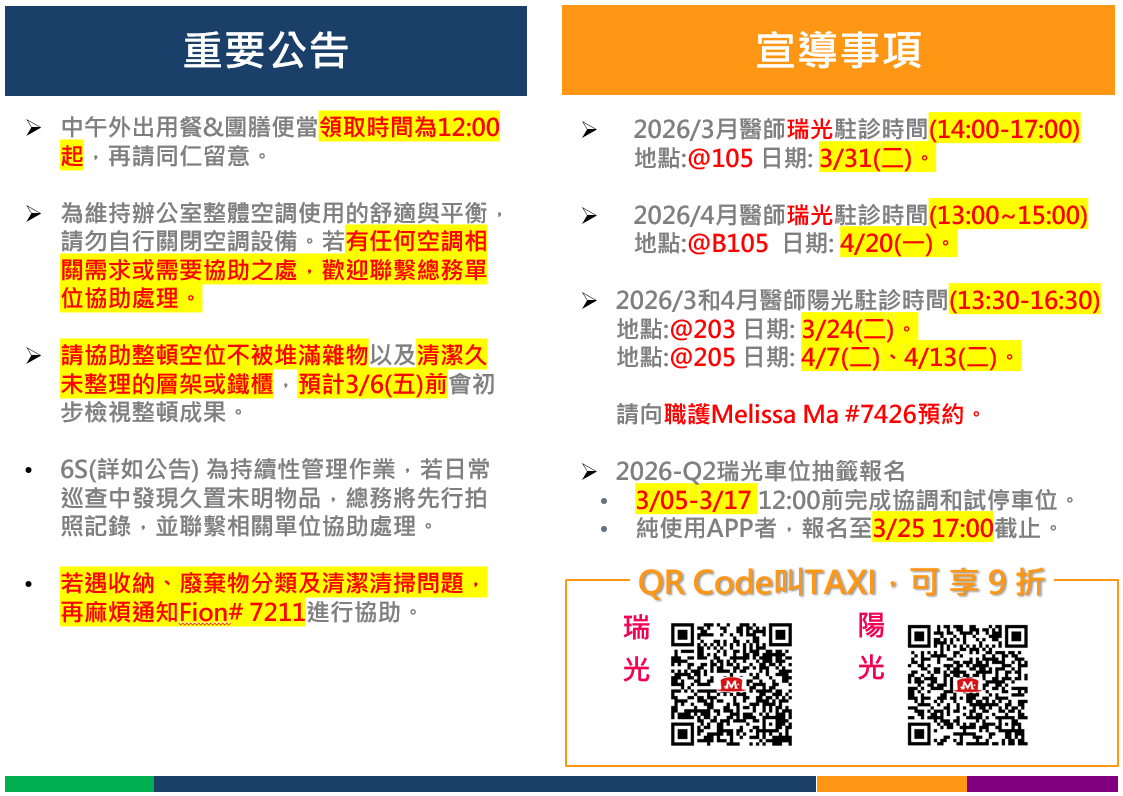 為使急救物品更好記錄與管理,陽光大樓急救箱使用4月起請至1樓櫃檯,並移除林口U棟1樓,讓大家在需要時更安心取得與使用。