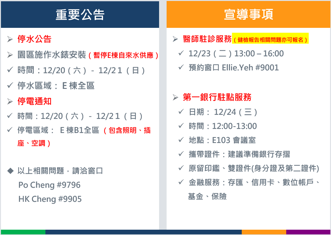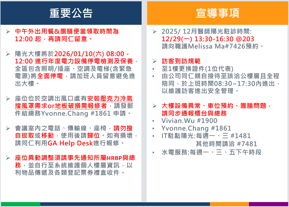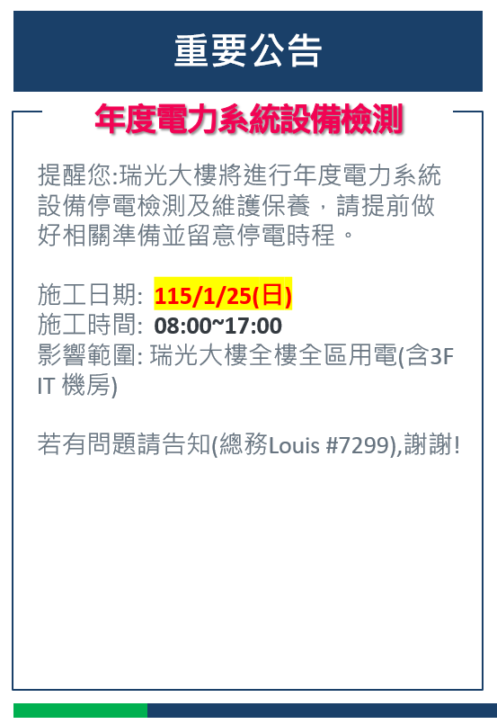 如有任何問題或建議,請聯繫 林口園區總務團隊,謝謝!