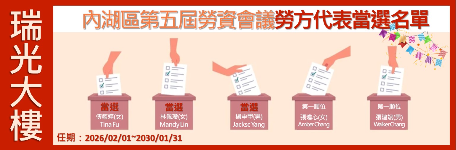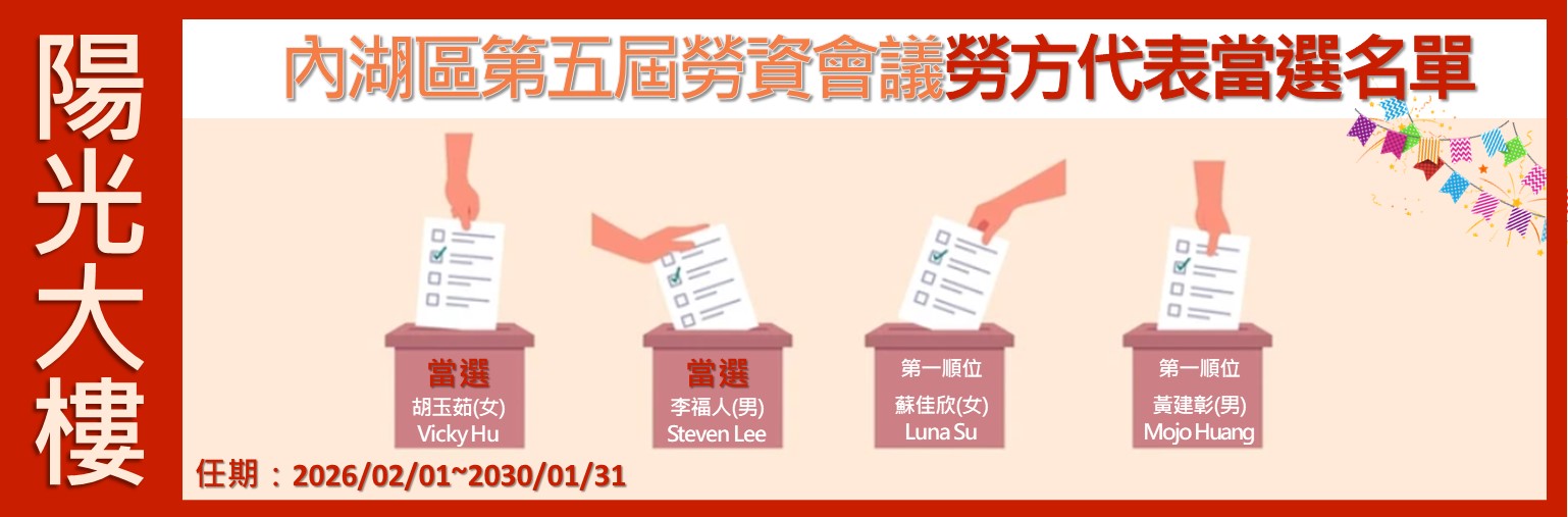 感謝各位候選人的積極參與,也感謝所有同仁熱情投票與支持。在此恭喜本屆當選的勞方代表,感謝您們願意投入時間與心力,❤️❤️代表同仁發聲並協助推動更完善的工作與職場溝通環境。