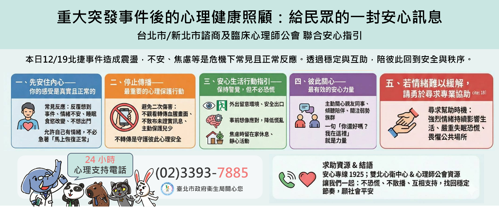 12月19日捷運突發事件,難免讓人心情不安。以下提供心理調適方式與資源,陪伴大家度過這段時間:
